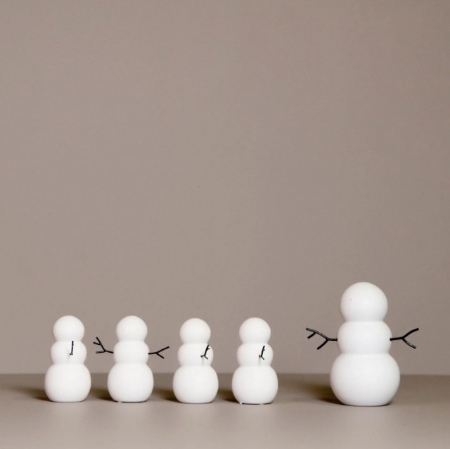 Snømannen er en klassisk hvit snømann av tre snøballer. Den sjermerende mannen har to svarte armer som ser ut som kvister. Pynt med en eller flere snømenn i vinduet, på matbordet eller under julemiddagen.