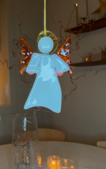 Når ein idé vert verkelegheit! Årets englar er trylla fram av dyktige Ingegerd Moene, som produserar vakker glaskunst i alle moglege fasongar. Materiale: Glass. Størrelse: ca 8,5cm høg og 6cm brei. Gaveøskje medfølgjer.