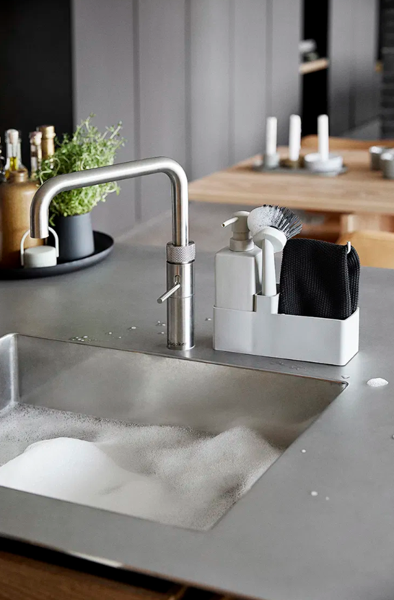 Zones populære alt-i-ett-oppvasksett med oppvaskklut. Såpedispenseren er laget i solid keramikk, og oppbevaringsdelen er av ripefri og rengjøringsvennlig silikon.