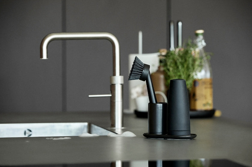 Oppvasksett med børste og pumpeflaske som står på et lekkert display. Passer perfekt inn i interiøret på kjøkkenet.