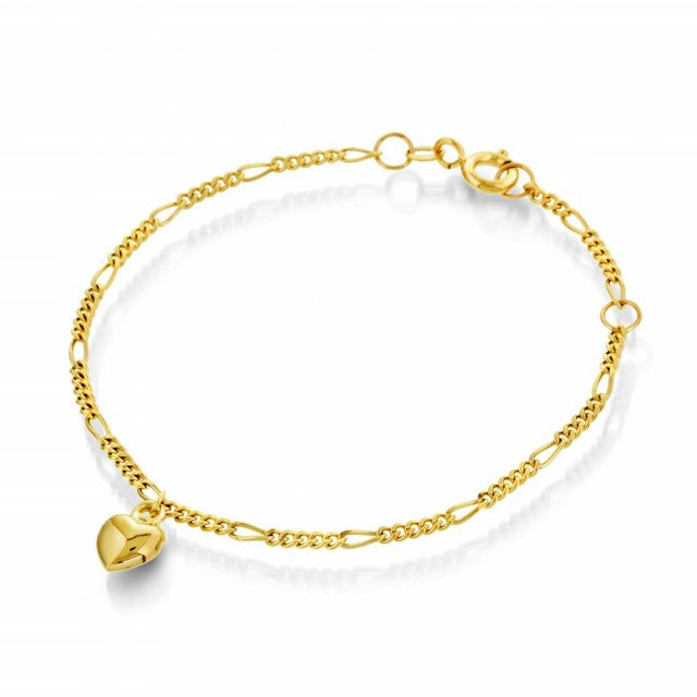 Klassisk figaro armbånd med hjerte-charm. Både armbånd og charm i gult gull 585/ 14k. Armbåndet med hjertet er en fin, symbolsk gave som barnet tar med seg gjennom livet.