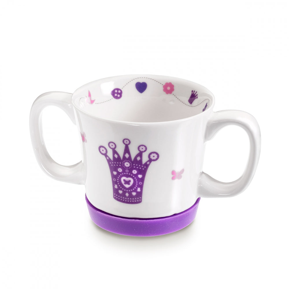 Prinsessekopp med dobbel hank og stødig silikon-bunn. Koppen tåler mikrobølgeovn og oppvaskmaskin. Flott gave til ei lita prinsesse!