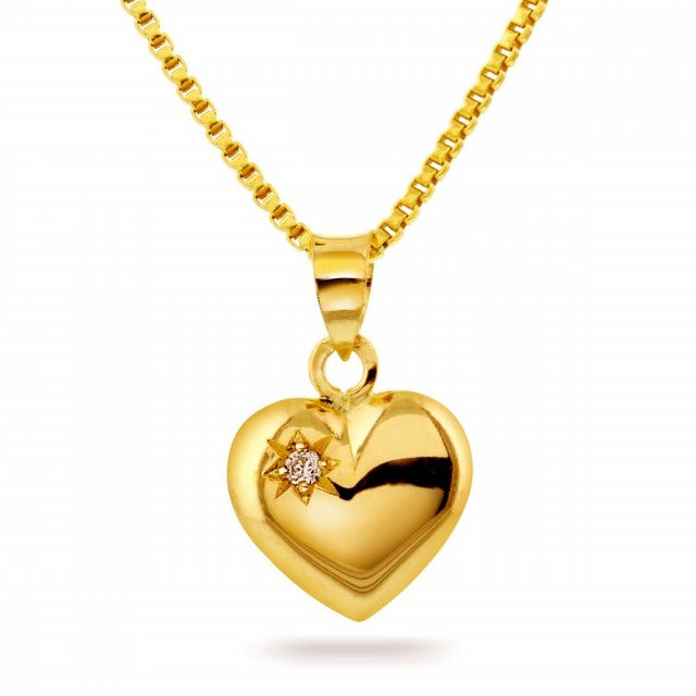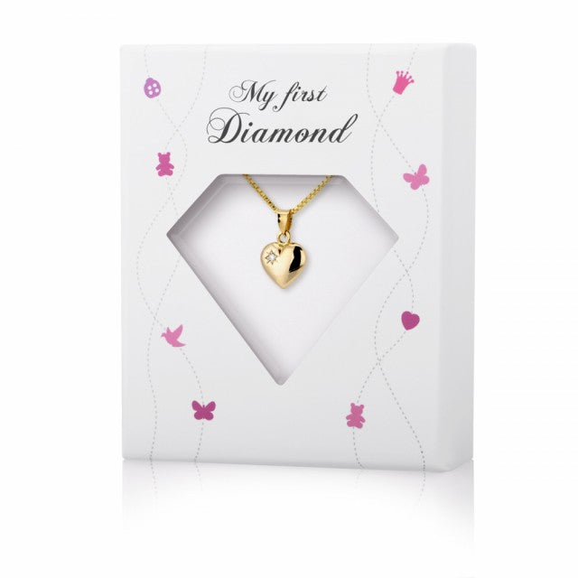 "Min første diamant"-hjerte i 14k gult gull med en 0,01ct GH/SI diamant. Dette er en varig gave barnet tar med seg hele livet.