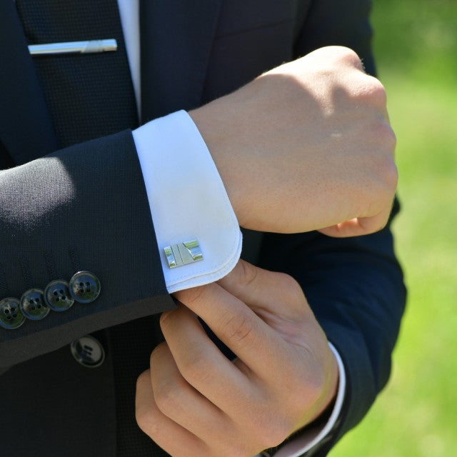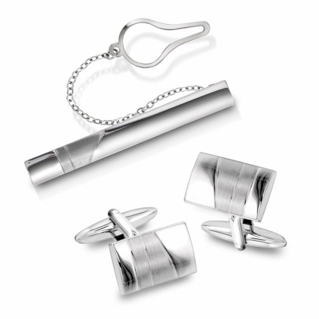 Bijouterisett i stål som inkluderer slipsnål og mansjettknapper. Slipsnålen har sikkerhetslenke. Sett-eske medfølger.