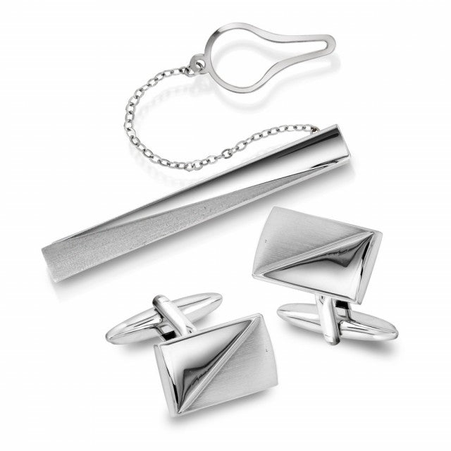 Manskjettknapper og slipsnål. Slipsnålen har sikkerhetslenke. Sett-eske medfølger.