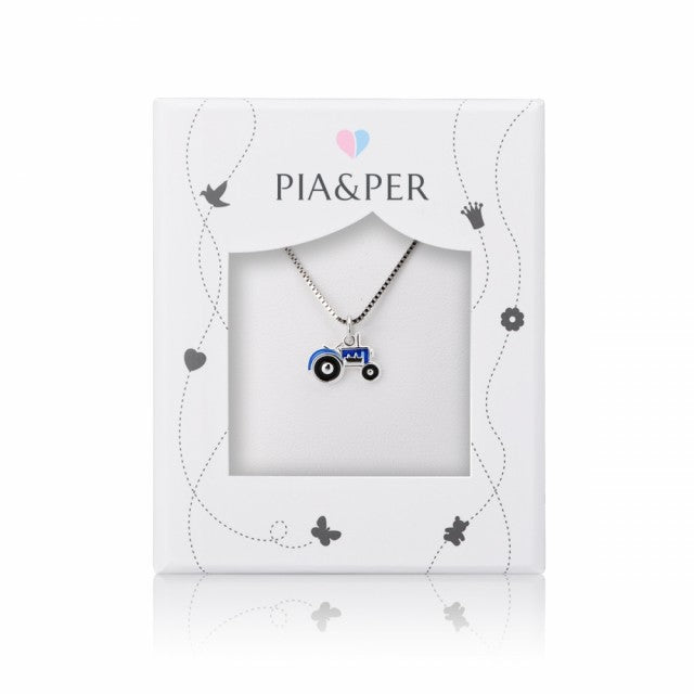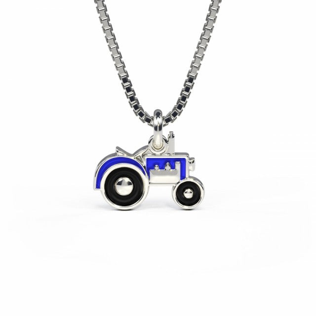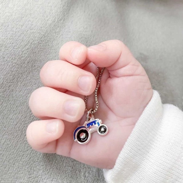 De fleste barn har en fascinasjon for store kjøretøy, enten det er brannbiler, motorsykler eller traktorer. Denne kule traktoren er vårt mest populære motiv til gutter og finnes som anheng, ID-armbånd og slipsnål. Fargene er nøye utvalgt, der grønn er inspirert av John Deere, blå er inspirert av Ford og rød er inspirert av Massey Ferguson. Dette smykket passer utmerket å gi som gave til dåp, navnefest og bursdag.