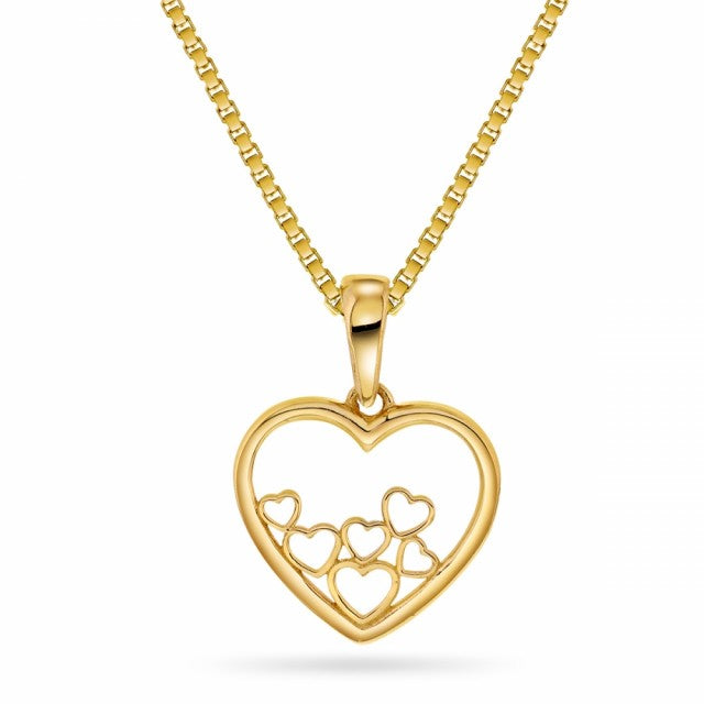 Smykke i 14k gult gull med hjerter. Veneziansk kjede i forgylt sølv på 42+3 cm medfølger, samt gaveeske.
