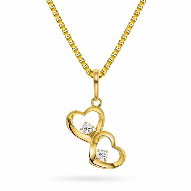 Smykke i 14k gult gull med to hjerter og zirkonia. Høyde: 13 mm.