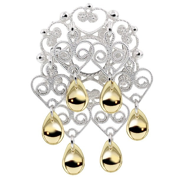 Oppdag denne vakre festsøljen fra vår populære serie med bunadsølv til barn. Den roseformede søljebunnen prydes av heng med seks dråpeformede, forgylte løv som gjør at denne søljen skinner litt ekstra til festantrekket ved store feiringer.