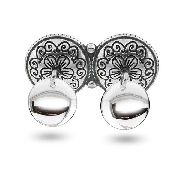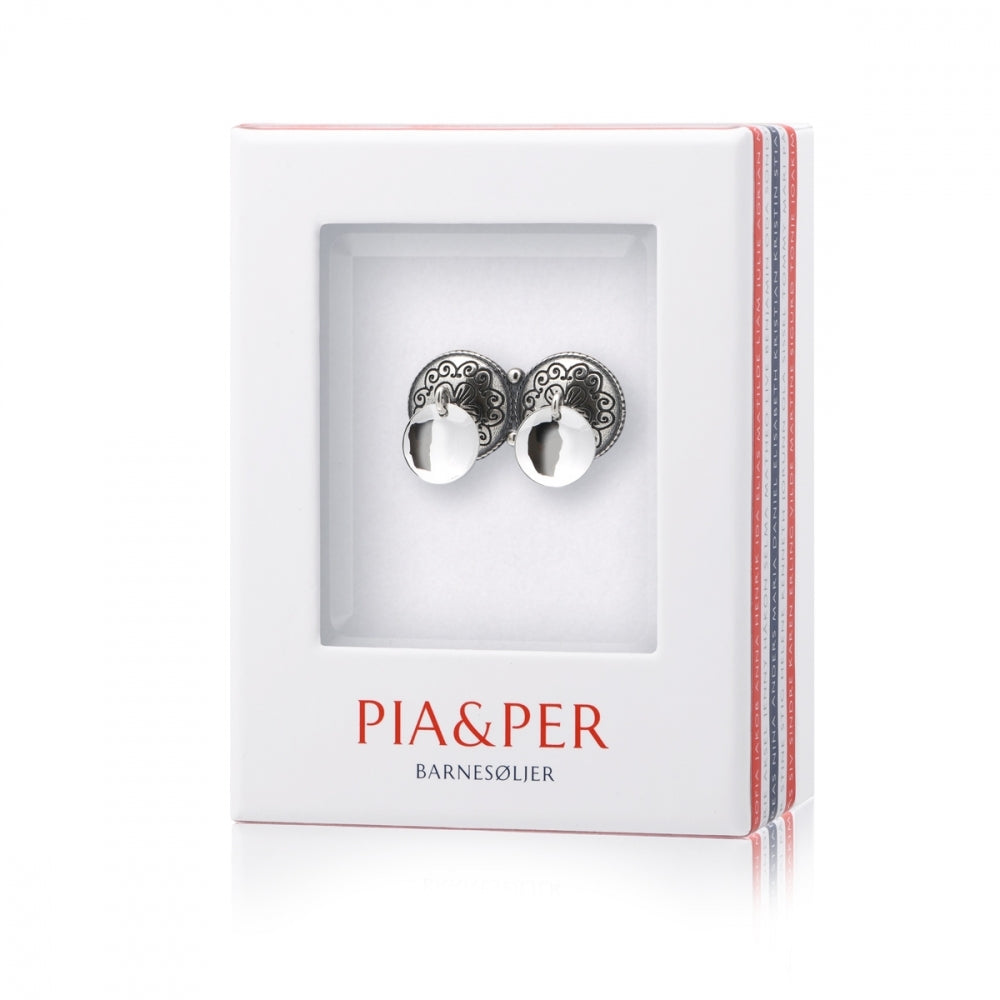 Fra Pia & Pers serie med bunadsølv til barn er denne doble halsknappen en populær gave til gutter og finnes både med og uten løv. Det tradisjonelle blomstermotivet gjør at den passer fint til alle festdrakter og bunader.