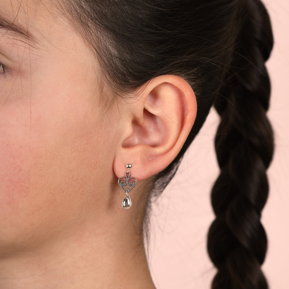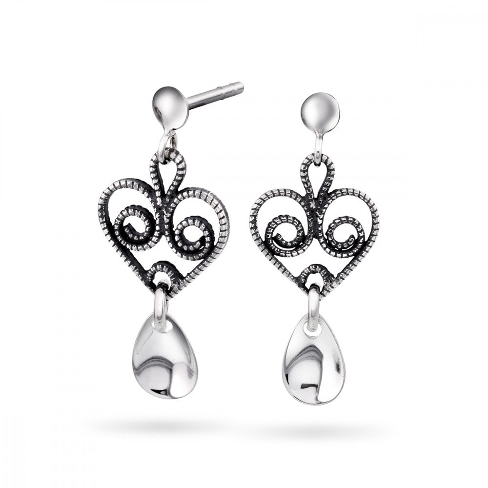 I Pia & Pers populære serie med bunadsølv til barn har vi ikke bare søljer og knapper, men også disse vakre ørehengene med dråpeformede løv.