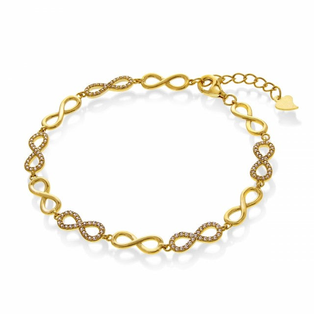 Armbånd med evighetstegn. Forgylt sølv og blanke zirkonia. Lengde 16+3 cm.