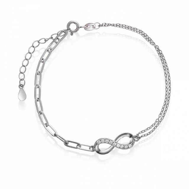 Armbånd i rhodinert sølv med evighetstegn og hvite zirkonia. Lengde: 17+3 cm.