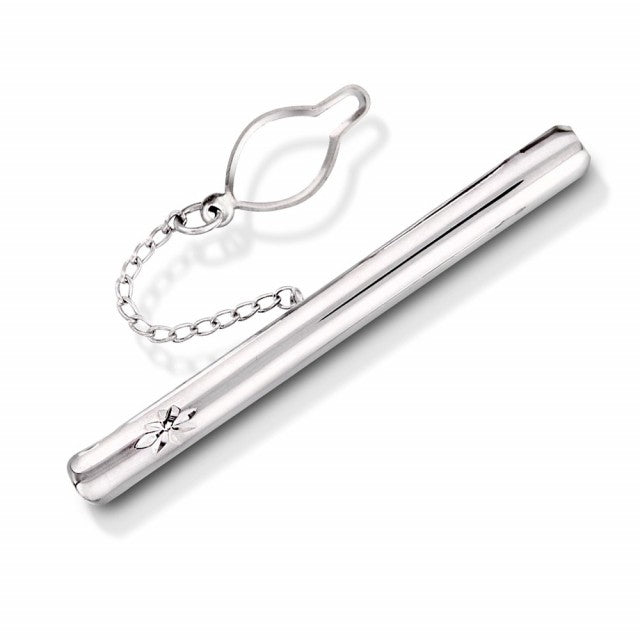 Slipsnål i rhodinert sølv med metall-bakstykke. B: 6 mm, L: 60 mm. Kommer i gaveeske.