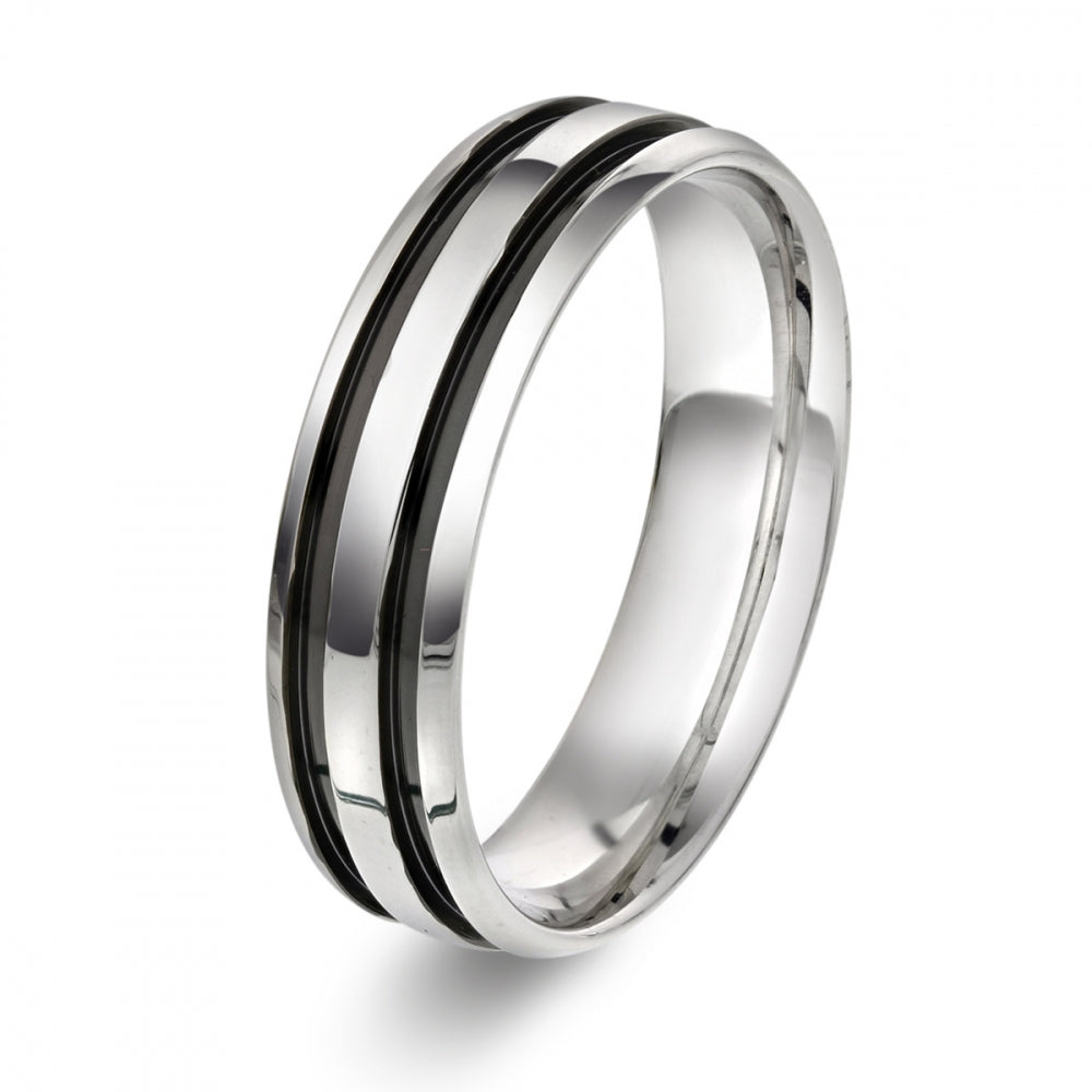 Ring i rhodinert sølv med sorte striper til herre.