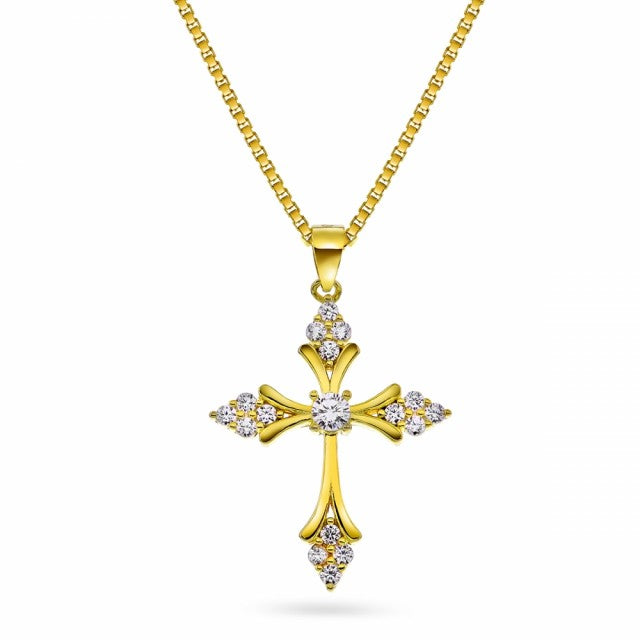 Smykke i forgylt sølv med zirkonia, Kors, fra Arne Nordlie. H: 25 mm, B: 19 mm.