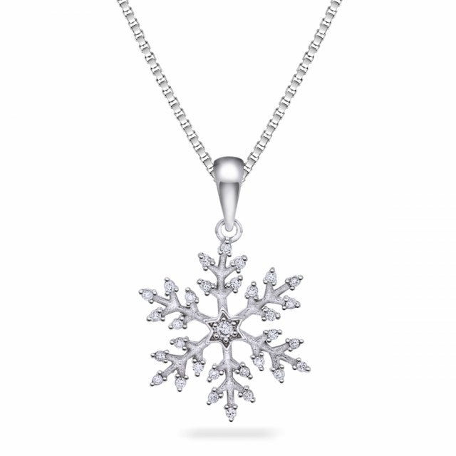 Smykke i rhodinert sølv med zirkonia, Snøfnugg. Veneziansk kjede i sølv på 42+3 cm medfølger.
