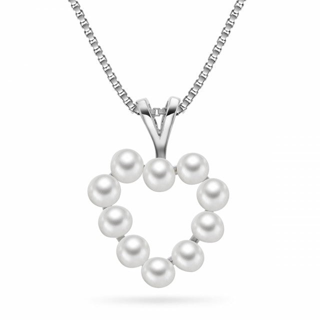 Smykke i rhodinert sølv med perler formet som et hjerte.