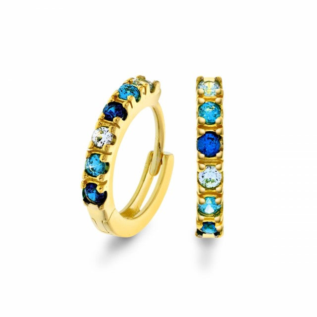 Øreringer i 925 forgylt sølv med blå zirkonia. Diameter: 14 mm.