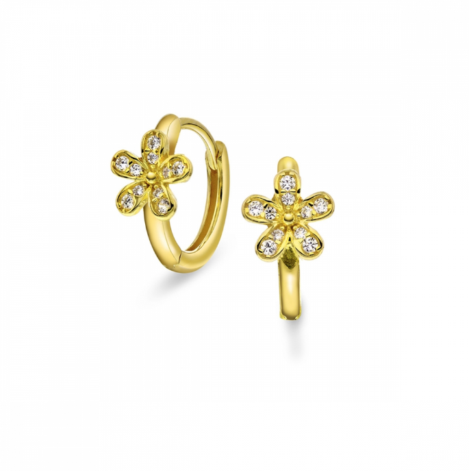 Øreringer i 925 forgylt sølv med blomst og zirkonia. Diameter: 12 mm.