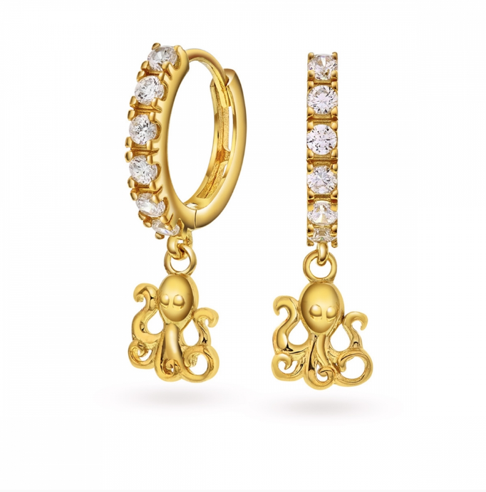 Øreringer i 925 forgylt sølv med hvite zirkonia og blekksprut fra Arne Nordlie. B: 2,5 mm, H: 15 mm.