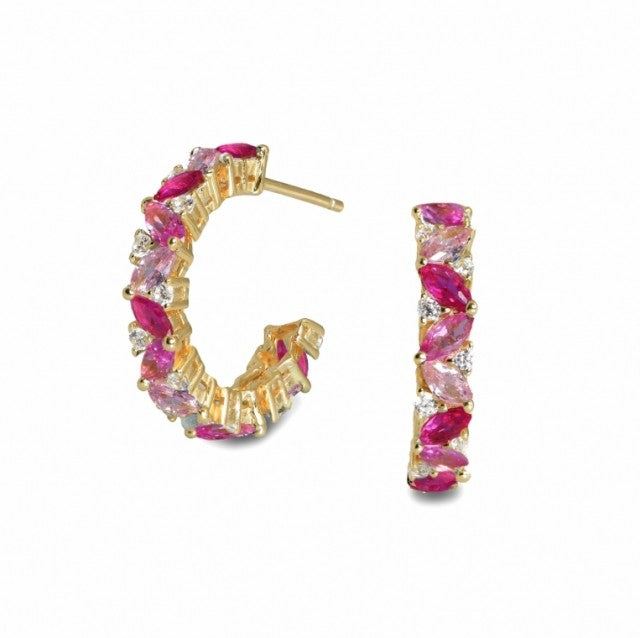 Nydelige kreoler i gullbelagt sølv med rosa zirkonia. Bredde: 3mm. Diameter: 19mm