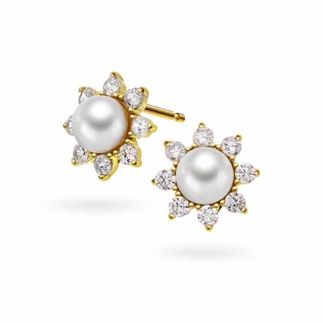 Øredobber i forgylt sølv med zirkonia og perle. B: 9 mm.
