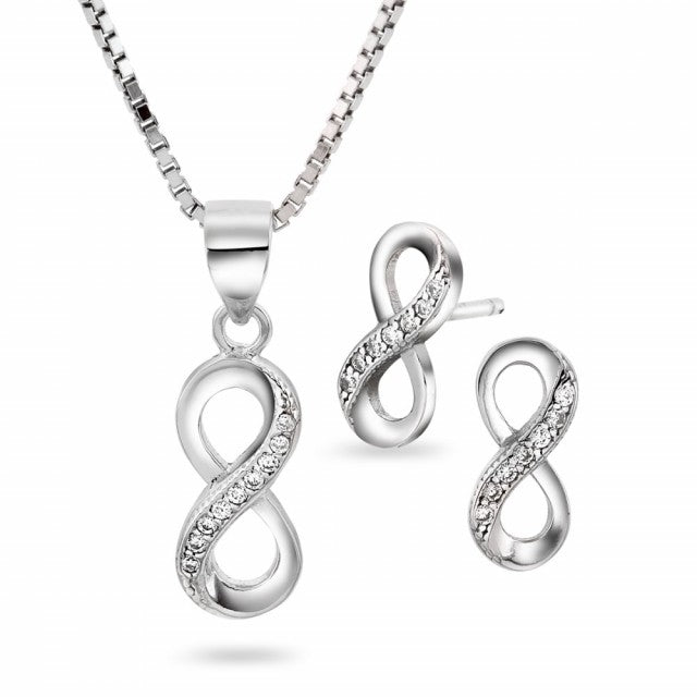 Smykkesett som inkluderer smykke og øredobber i rhodinert sølv med zirkonia fra Arne Nordlie. Evighetstegn som symboliserer evigheten. Høyde anheng 14 mm. Høyde ørepynt 11 mm. Rhodinert sølvkjede 42+3 cm medfølger, samt gaveeske.