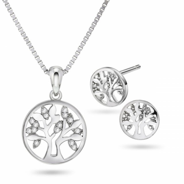 Sølvsett m/zirkonia. Med livets tre halskjede får man et personlig og pent smykke, der treet kan symbolisere alt fra liv og glede, til familie eller savn. Diameter anheng: 14mm. Diameter ørepynt: 7 mm. Rhodinert sølvkjede 42+3 cm medfølger.