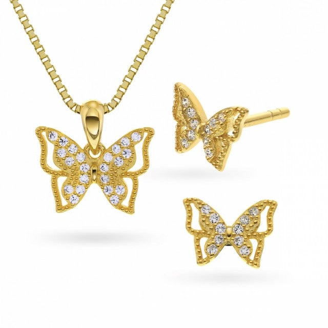 Et nydelig gavesett som inneholder smykke og øredobber i 925 forgylt sølv med sommerfugl og zirkonia. B: 8 mm/15 mm.