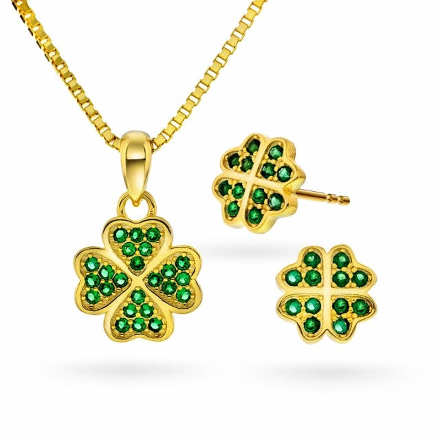 Smykkesett i forgylt sølv med grønn zirkonia, Firkløver