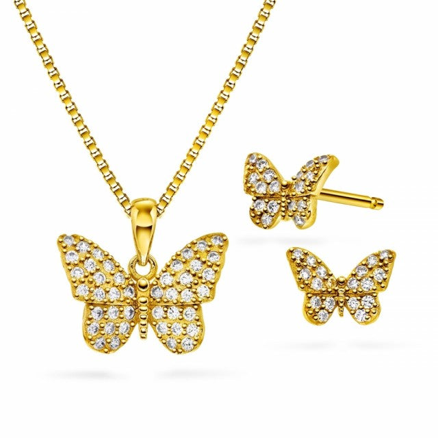 Smykkesett i forgylt sølv med sommerfugl og zirkonia. Bredde anheng: 14 mm. Lengde kjede: 42+3cm. Bredde ørepynt: 7 mm.