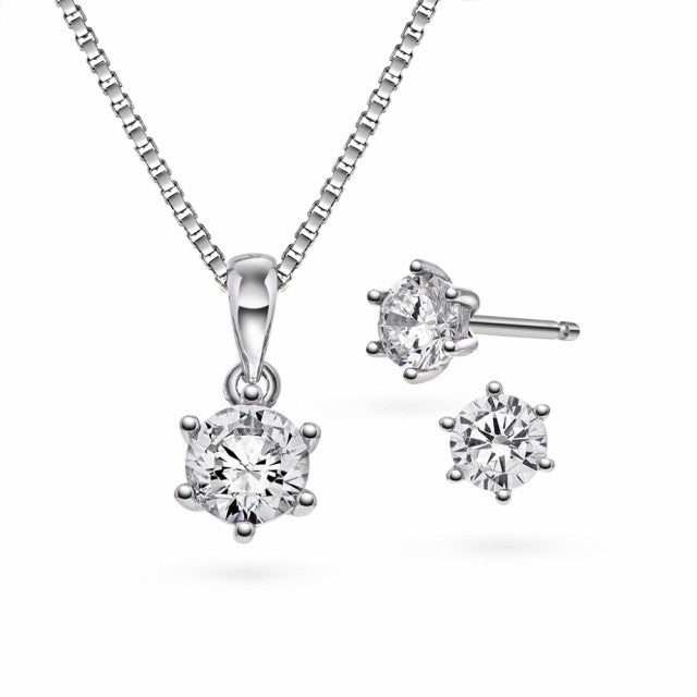 Smykkesett i rhodinert sølv med hvit zirkonia. Bredde anheng: 7 mm. Lengde kjede: 42+3cm. Bredde ørepynt: 6 mm.