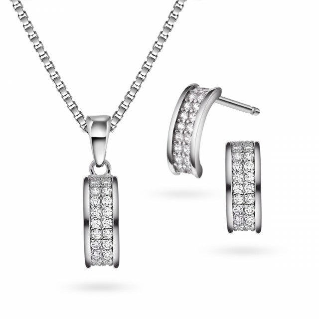 Smykkesett som inkluderer smykke og øredobber i rhodinert sølv med zirkonia fra Arne Nordlie.