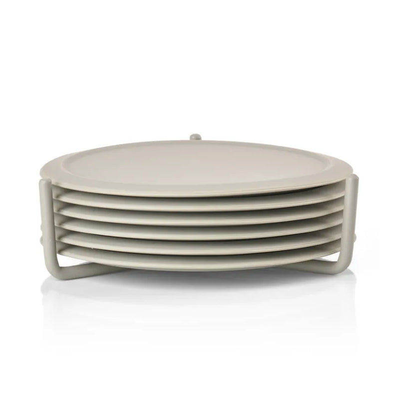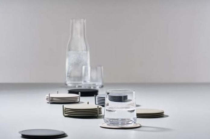 En myk og stille landing er en god beskrivelse av hvordan du setter ned et glass på underlaget, og skulle det renne en dråpe ned langs med glasset så stopper den på underlagets overflate uten å renne ut på bordplaten. Den praktiske holderen gjør det enkelt å holde glassunderlagene sammen når de er stablet oppå hverandre, og den blir dessuten en fin detalj å ha på bordet.