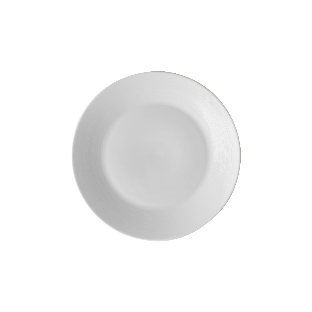 En asjett til frokost, lunsj eller småretter med et tidløst og diskret design i klassisk hvit. Teksturen er inspirert av norsk håndverk, med enkle relieffer som danner en myk form for minimalisme langs servisets kant.