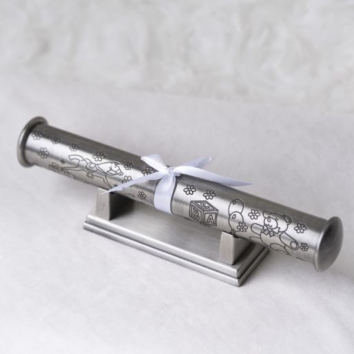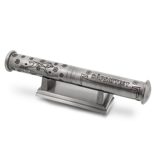 Dåpsattestholder i fortinnet sink med stativ, fra Prins & Prinsesse. H: 6,5 cm, B: 24,5 cm. Hvitt silkebånd og fin gaveeske medfølger.