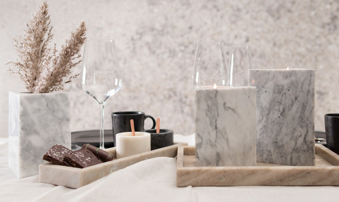 Vær obs på å plassere stoffer som kan farge av, som syre, stekefett, kaffe og bærsaft, da marmor er en porøs stensort.