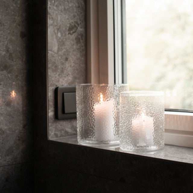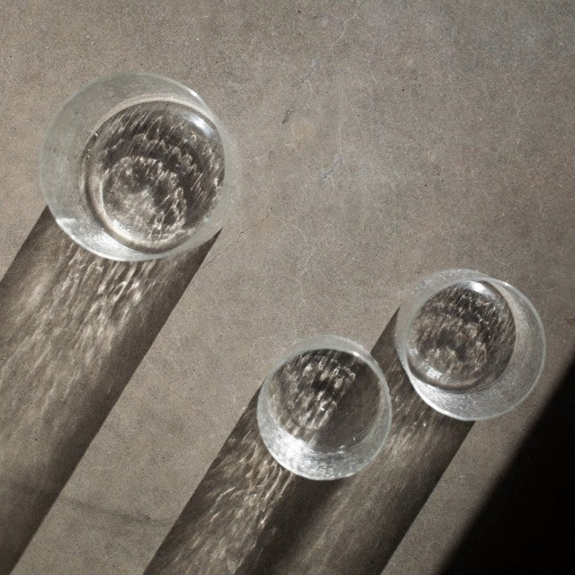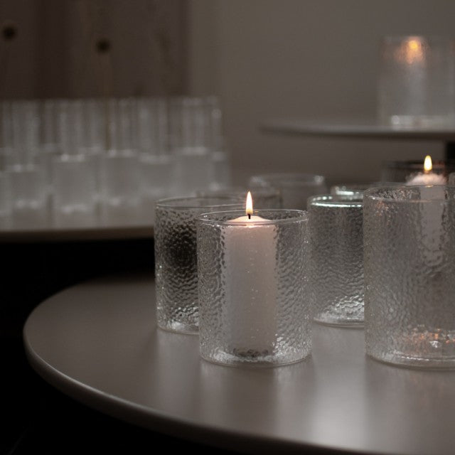 En serie i uregelmessig glass som passer perfekt til å tenne lys i. Kan også brukes som potte til å plante svibler og andre blomster og planter i. Vanntett. Finnes i to størrelser.
