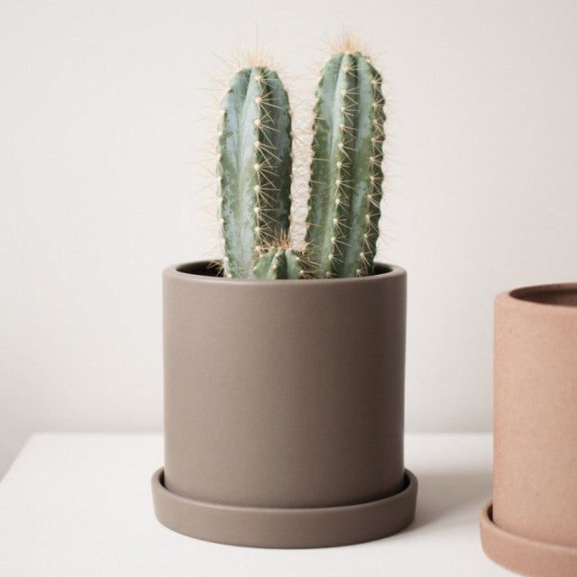 Grow potte med fat Ø13cm fra svenske DBKD er en minimalistisk sylinderformet blomsterkrukke med tilhørende fat av keramikk. Krukken har et dreneringshull som fører bort overflødig vann og beskytter plantens røtter mot overvanning.