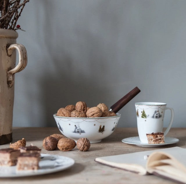 Julemorgen Story bolle 17 cm er mellomstor og elegant med sine feminine kurver. Den er perfekt til å servere tilbehør til middagen, noe søtt til kaffen eller hva annet som måtte friste. Når den ikke brukes til servering kan den brukes som en liten lyslykt, smykkeskrin eller bare stå fremme som et dekorativt element.