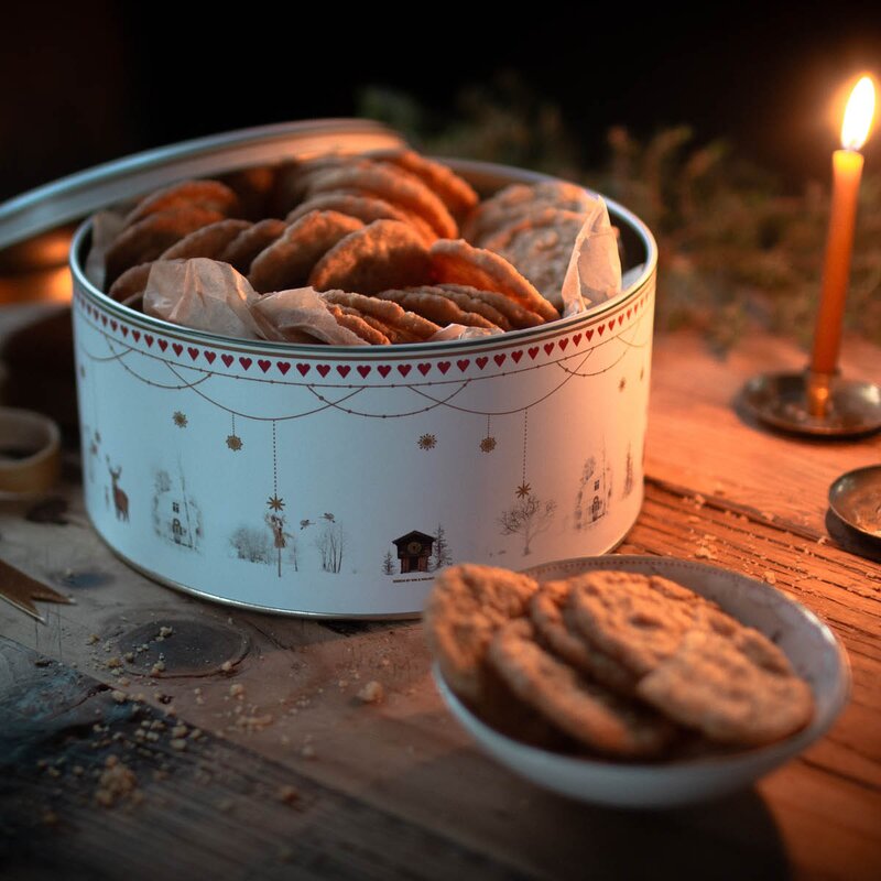 De solide boksene egner seg perfekt til oppbevaring av hjemmelagde julekaker, nøtter eller annet juleknask. Lokket beskytter innholdet, samtidig som boksene gjerne kan stå fremme som en del av julepynten.