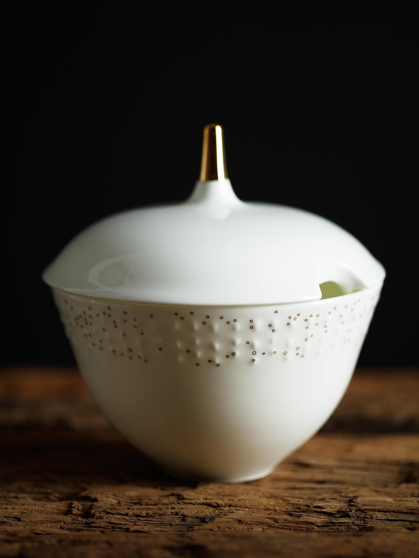 Lys kjennetegnes av et glansfull og edelt utseende. Serviset skaper en rolig atmosfære og myke omgivelser. Et lett mønster av små snøflak, tilført snødryss i 24 karat gull som pryder kantene på det vakre serviset. Lys er laget av edelt benporselen som kjennetegnes ved sin vakre gjennomskinnelighet.