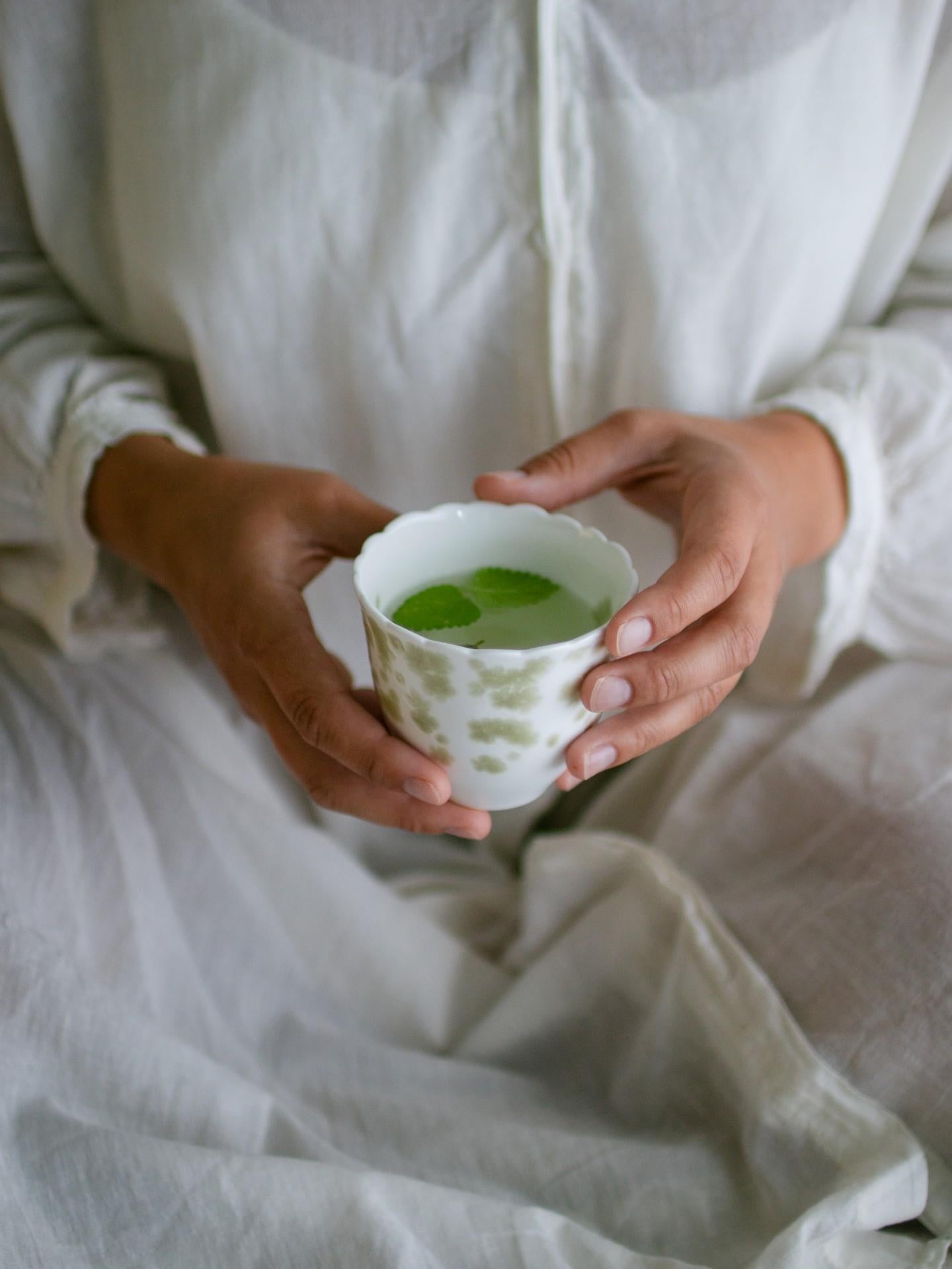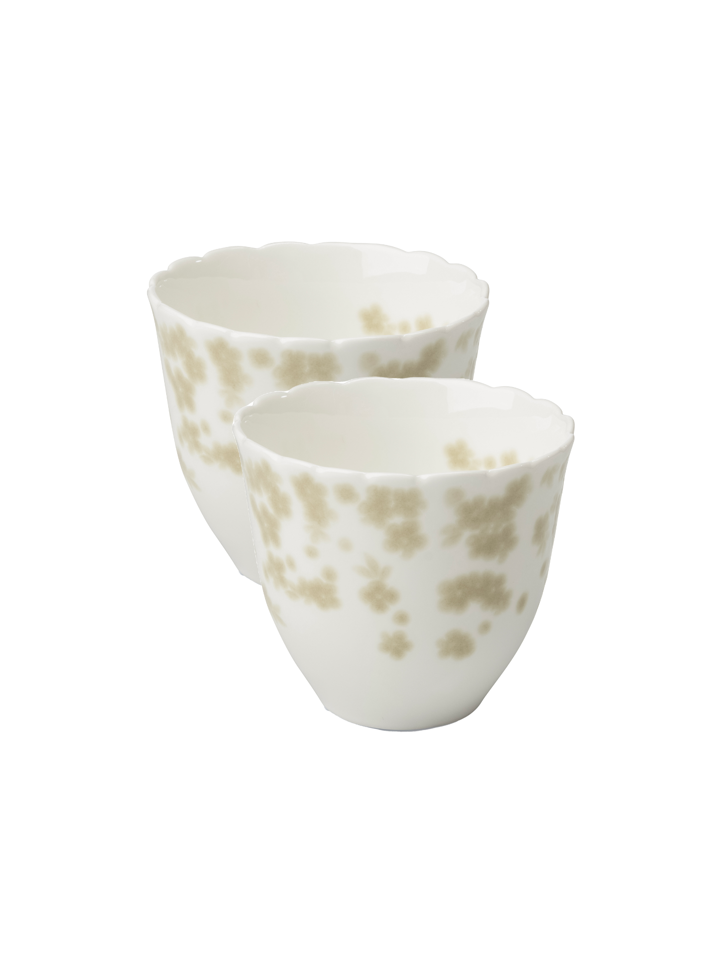 Slåpeblom kopp uten hank i edelt benporselen av høy kvalitet. Slåpeblom kjennetegnes ved den ujevne og bølgete kanten som fremhever følelsen av håndverk. Koppens runde form gjør at den ligger godt i håndflaten, skapt for å gi en lun og behagelig varme. Koppen kan stables og høyden er tilpasset de fleste typer kaffemaskiner. Med koppen i hendene kan man kjenne det taktile mønsteret som pryder det vakre designet.