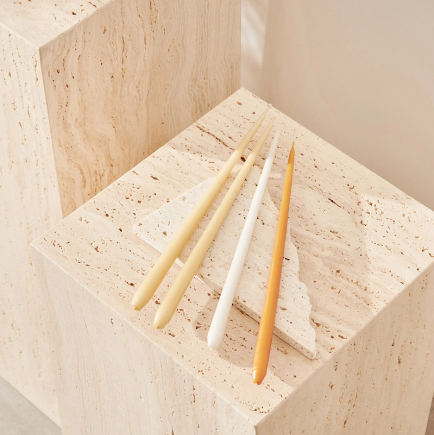 De eksklusive STOFF-lysene fra Ester & Erik har en lang og konisk form med en kjegleformet bunn slik at de passer perfekt i STOFF Nagel lysestaker. Stearinlysene drypper ikke, de slukker selv og brenner ut sakte og elegant.