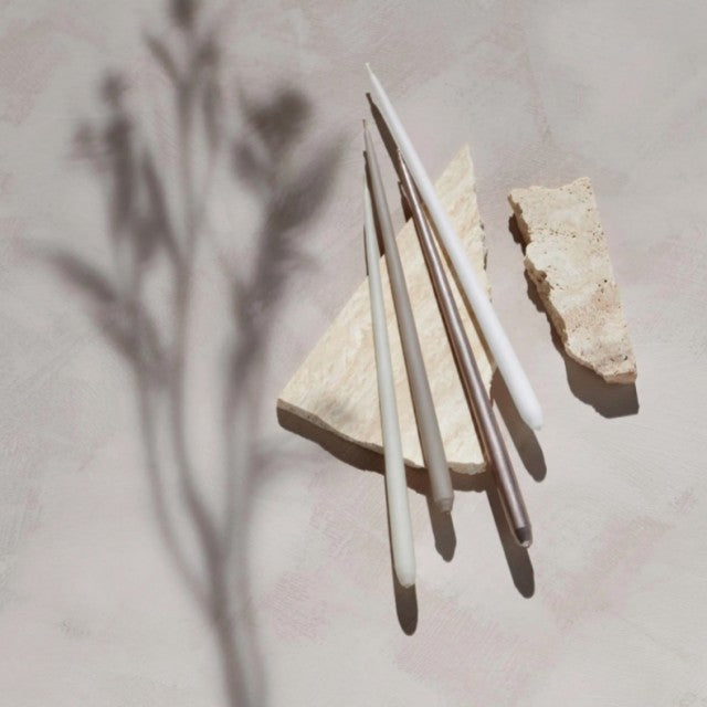 De eksklusive STOFF-lysene fra Ester & Erik har en lang og konisk form med en kegleformet bunn slik at de passer perfekt i STOFF Nagel lysestaker. Stearinlysene drypper ikke, de slukker selv og brenner ut sakte og elegant.