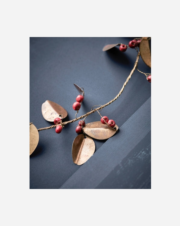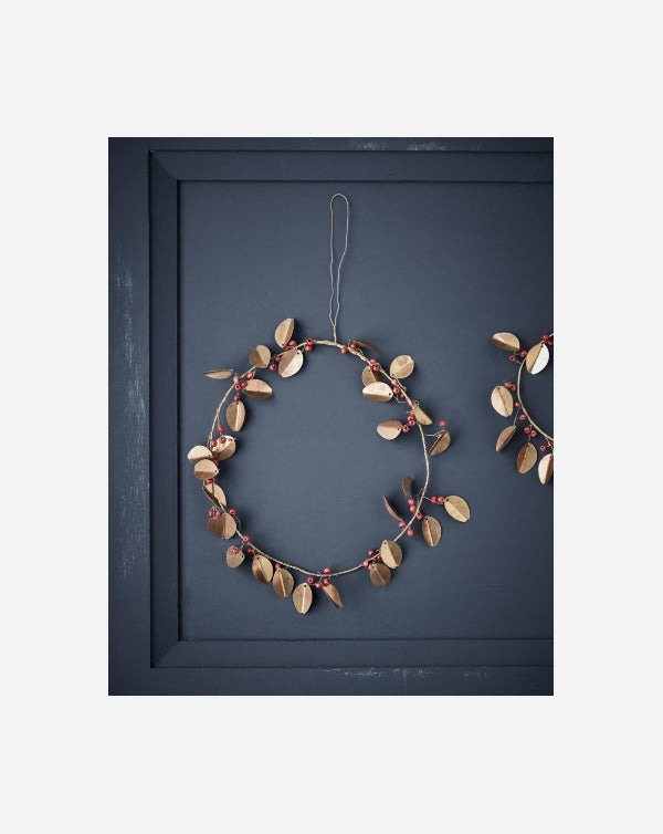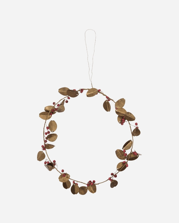 Krans hører med når du pynter hjemmet ditt til jul. Skap en festlig stemning med denne håndlagde kransen fra House Doctor, laget med gylne messingblader og røde treperler.