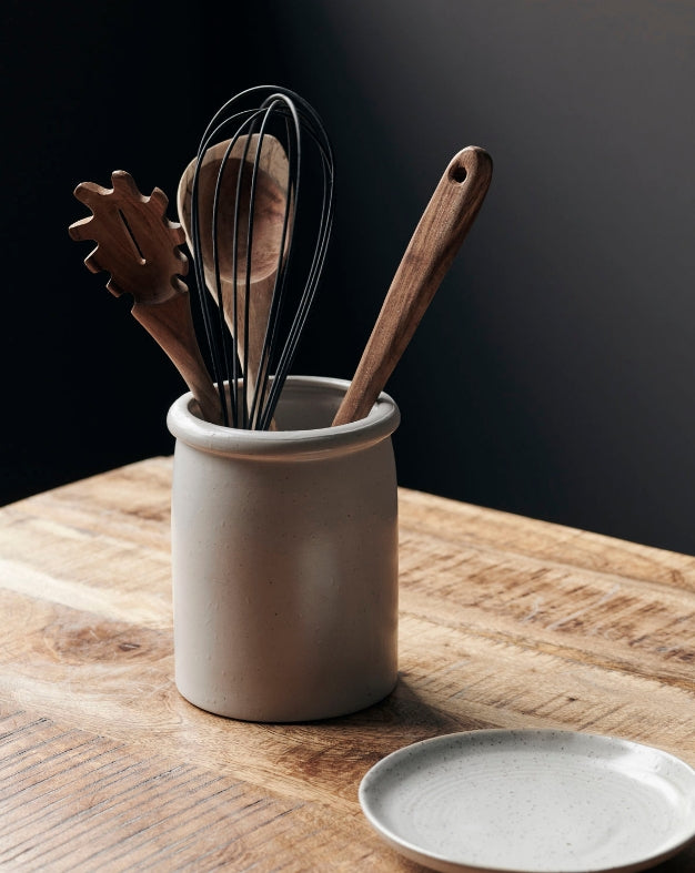 I stedet for å ha stekespader, visper og treslever i skuffen, still dem fram på kjøkkenbenken og ha dem i nærheten når du skal bruke dem i hverdagens matlaging. Krukken er et fint tillegg til kjøkkeninnredningen og vil passe godt til enhver stil og fargevalg. Bruksspor og risser kan ikke unngås på grunn av den matte glasuren og overflaten. Dette er en del av sjarmen med Pions design og noe som gir produktet mer karakter.
