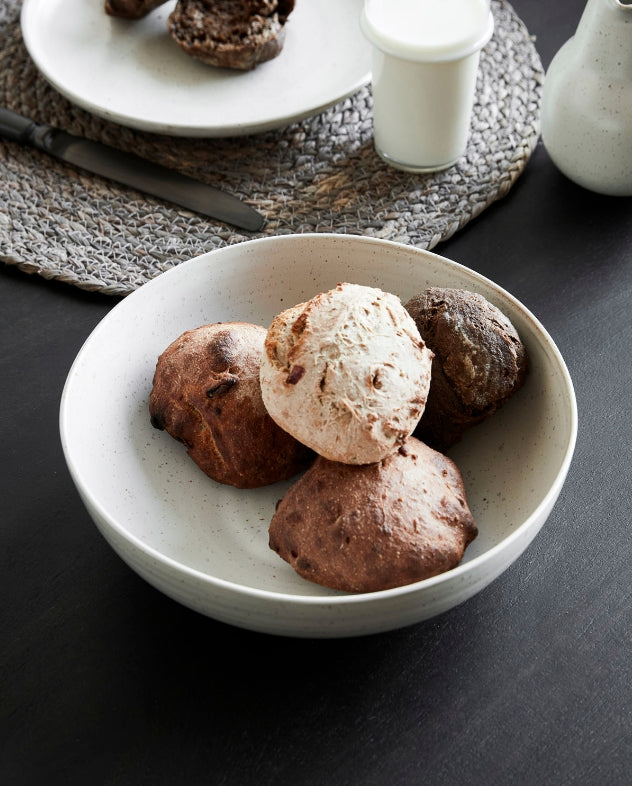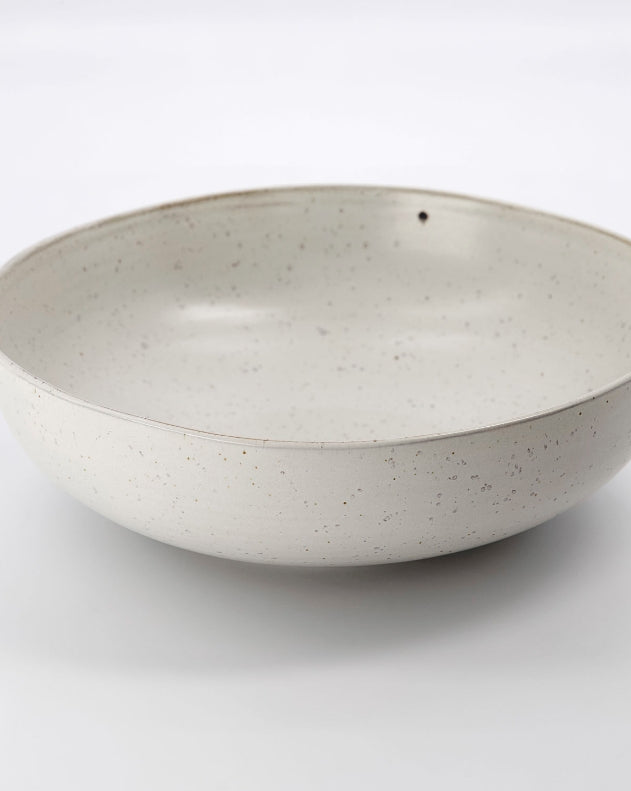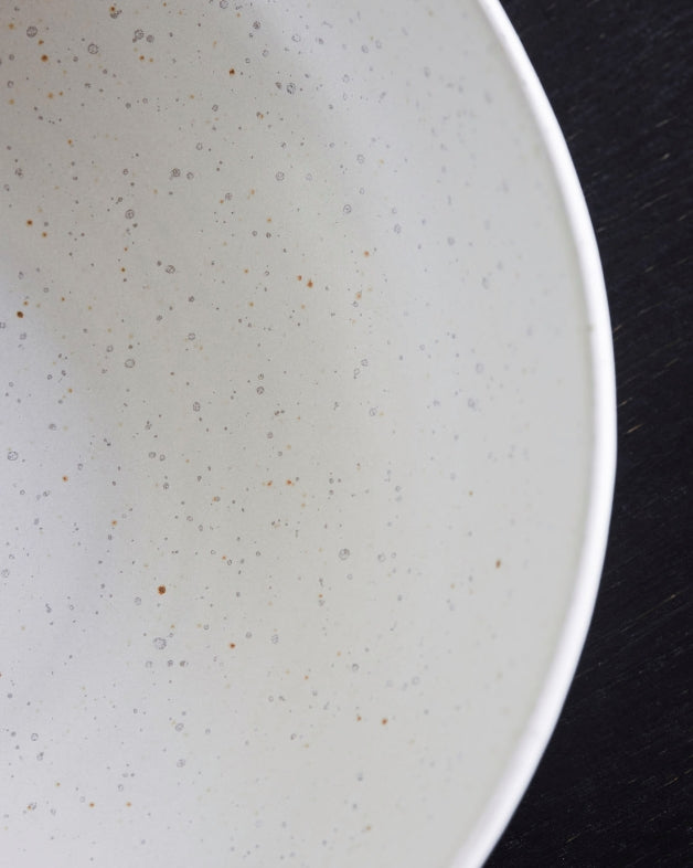 Den hvite skålen, kalt Pion, er designet for å servere maten på middagsbordet. Den er laget av steintøy, har fått en hvit, flekkete glasur for et uformelt, men likevel elegant utseende.