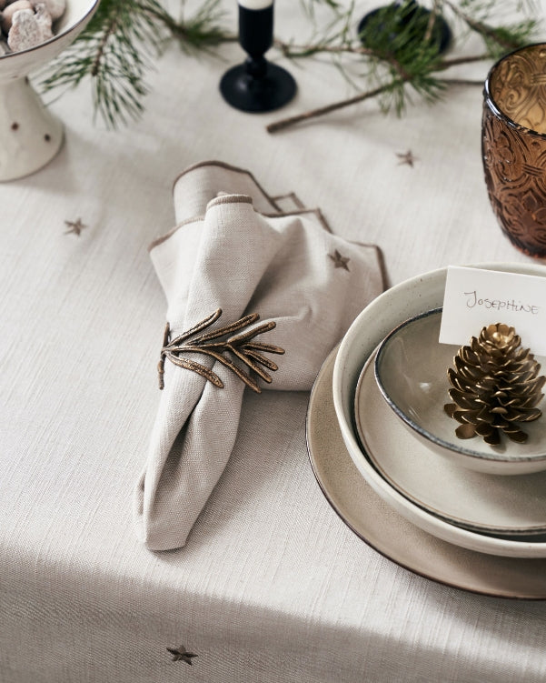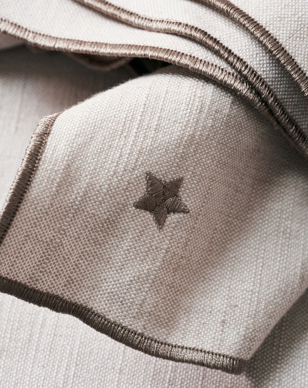 Serviettene avrundes med en brodert stjerne og en dekorativ søm langs kanten for å skape et diskret, men sofistikert uttrykk. Sammen med et hvitt juleservise eller annet lett servise, vil julebordet ditt få et rolig og elegant uttrykk. Kombiner gjerne med bordduken i samme serie.